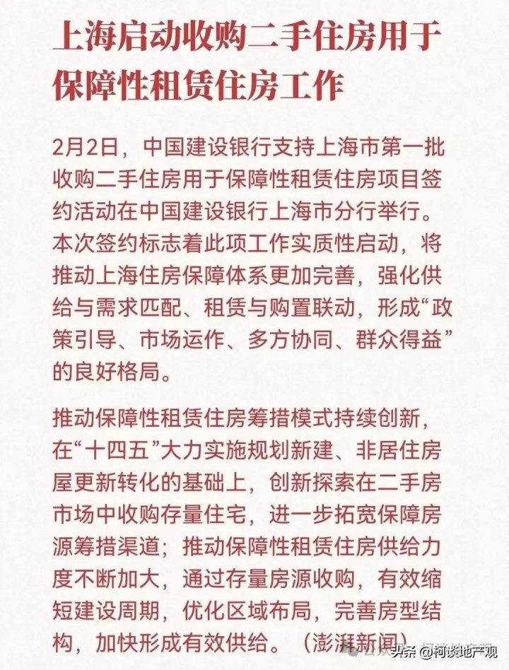 上周,上海静安官宣政府下场收购二手房,昨天2026年2月2日,上海市举行了收购二手房用于保障性租赁住房项目签约活动,浦东、静安、徐汇三区率先开展试点,中国建设银行提供金融支持,各区公租房公司为收购主体。