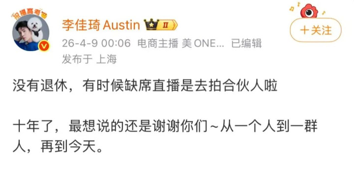 4月9日凌晨,好意思妆“头部”主播李佳琦在个东说念主外交账号发文,否定有退休策画,称我方在4月8日的一个仪式活动上发言时口误了。