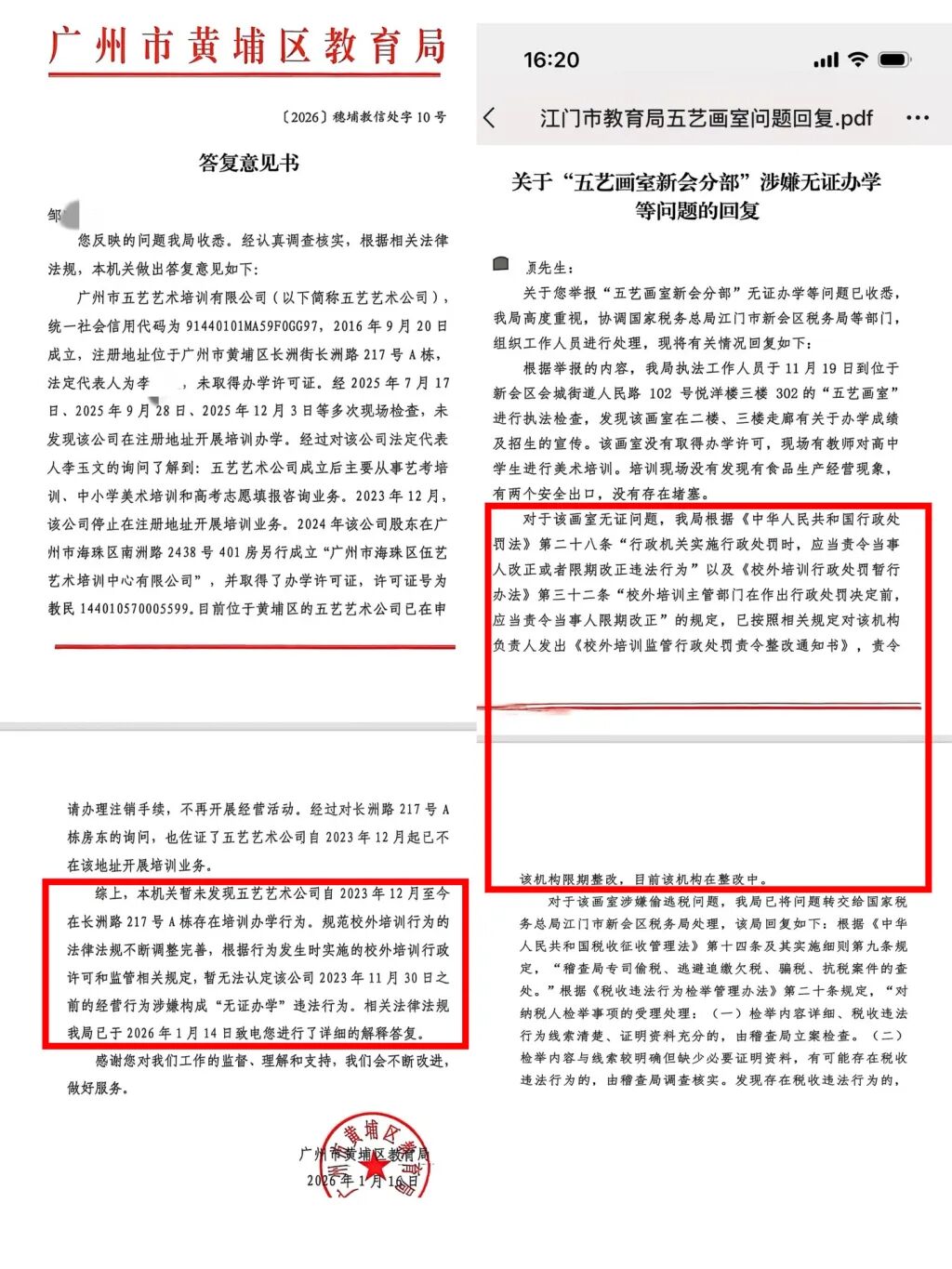 邹先生举报五艺画室涉嫌违规办学,广州黄埔区教育局、江门新会区教育局曾作出答复