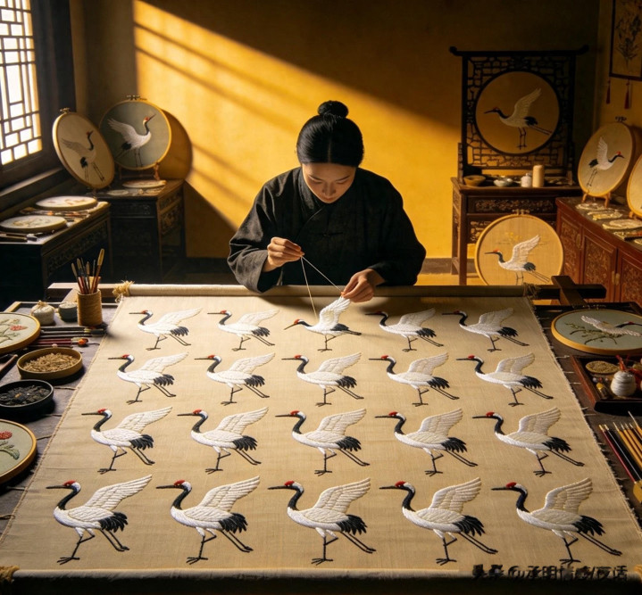 祖母临终前交给我一幅未完成的百鹤图,针脚里藏着血渍:“记着,绣到第99只就停手。”