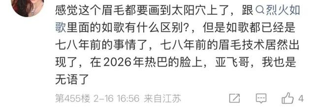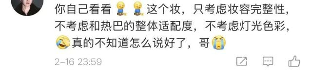 有网友在其接头区提到,这次王亚飞给热巴化妆的口红色号“太淡”,显得热巴没气色。也有网友提到,“眉毛皆要画到太阳穴上了”,更赞好意思:“别拖后腿了行不能,这个眉毛、这个唇色,说来话长……大过年的孝敬一个黑热搜你可真行哈。”